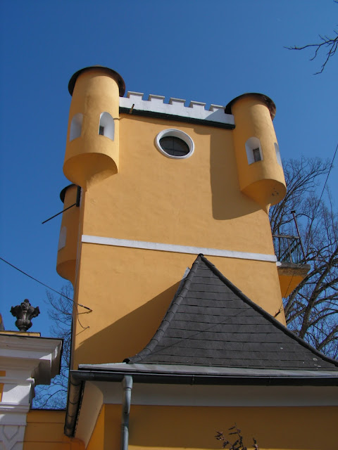 Ahogy a Mauzóleum felől lepillantottam a város (Ehrenhausen) felé, feltűnt a túloldalon egy kikerics sárga kastély. Szerencsére könnyű volt oda találni, mivel ha lejöttünk a Mauzóleumtól, akkor végig kell menni a rövid főutcán, majd a Mura felé menő utat keresztezve azonnal jobbra kell fordulni. Még gyalog sem egy nagy út. Ami az egészben a legmegdöbbentőbb, hogy a kastély úgy néz ki, mind ha tegnap adták volna át. Én is először arra gondoltam, hogy valami újgazdag építtette ezt. Itthon utána nézve kiderült, hogy bár nem olyan régi, mint a környék kastélyai vagy várai, de ez is meg van vagy 160 éves! A már több helyen feltűnt Attemsek építtették Tudor stílusban, de viszonylag hamar megváltak tőle (hogy miért?). A II. VH-ban sebesült kórház volt itt. A terület angol megszállás alá került, de úgy látszik Ők sem viselkedtek túl kulturáltan, mert a kastély áldozatul esett a megszálló erőknek. Rövid ideig kocsma volt itt, majd végleg bezártak. 2004-ben teljesen felújították a kastélyt, étterem, konferenciaterem található itt. A kastély felől szép kilátás van a Mauzóleum és a Ehrenhausen kastély felé. A neve egyébként magyarul: Örmény kastély, erre nem találtam semmi magyarázatot.